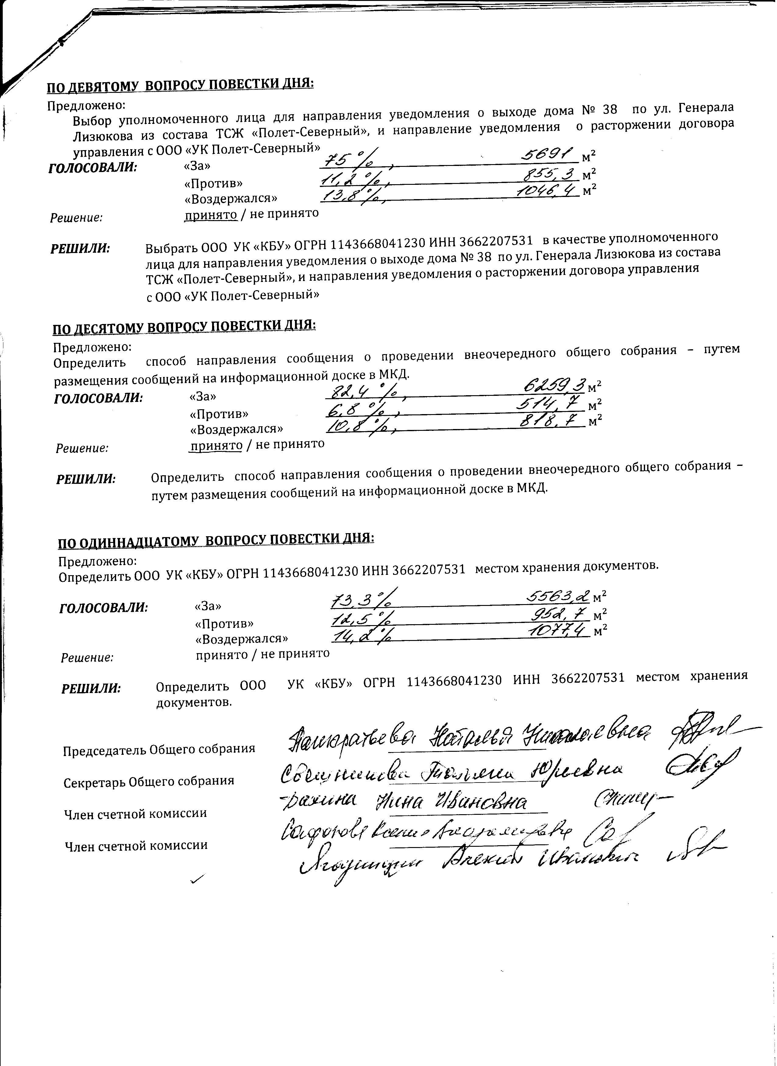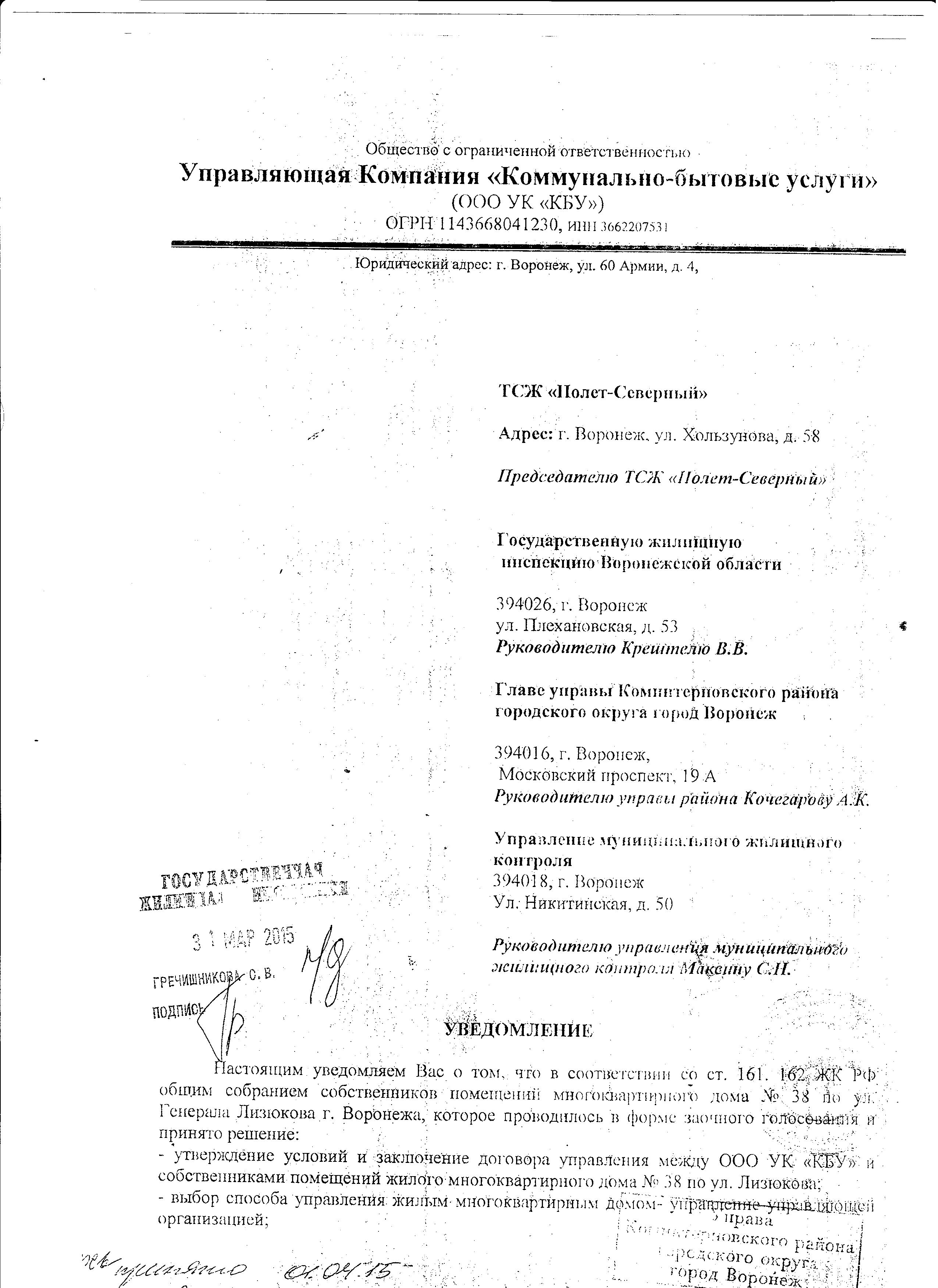 В соответствии с действующим законодательством ООО УК «КБУ» совместно с избранным Советом дома, представили оформленные уведомления о проведении внеочередного общего собрания в уполномоченные органы и организации.